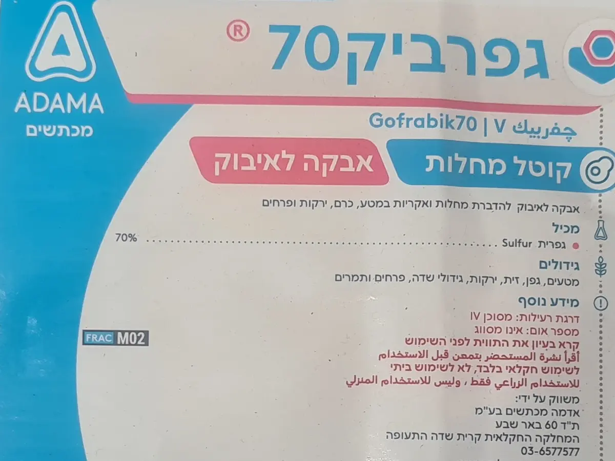 • שימושים: איבוק למחלת אקריות לאוכמניות, גפן וזית